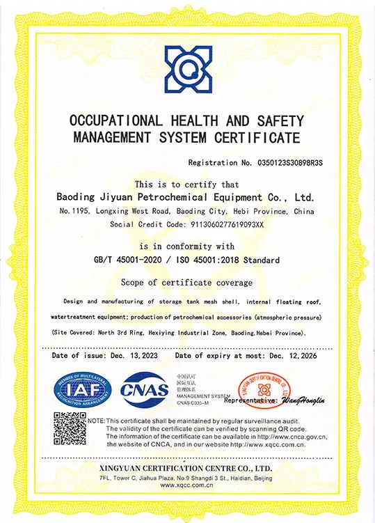 Цзиюань Нефтехимия является профессиональным производителем, занимающимся оборудованием для хранения и транспортировки нефтехимической продукции, а также трубопроводной арматурой, предприятием, сертифицированным по международному стандарту качества ISO9001. Неоднократно признавалась предприятием, соблюдающим контракты и пользующимся доверием, Администрацией промышленности и торговли провинции Хэбэй. После реорганизации компания в апреле 2006 года получила сертификат соответствия международной системе менеджмента качества ISO 9001. Усиливая управление системой качества и повышая доверие к продукции, компания уделяет еще больше внимания повышению научно-технического уровня продукции. При технической поддержке проектного института нефтехимии Лояна, на основе национальной патентной технологии № SEDZ (94)—2—116/B—69, осуществляет разработку, изготовление и монтаж внутренних плавающих крыш для крупногабаритных пространственных резервуаров и арматуры резервуаров. И достигла соответствующих социальных эффектов.
